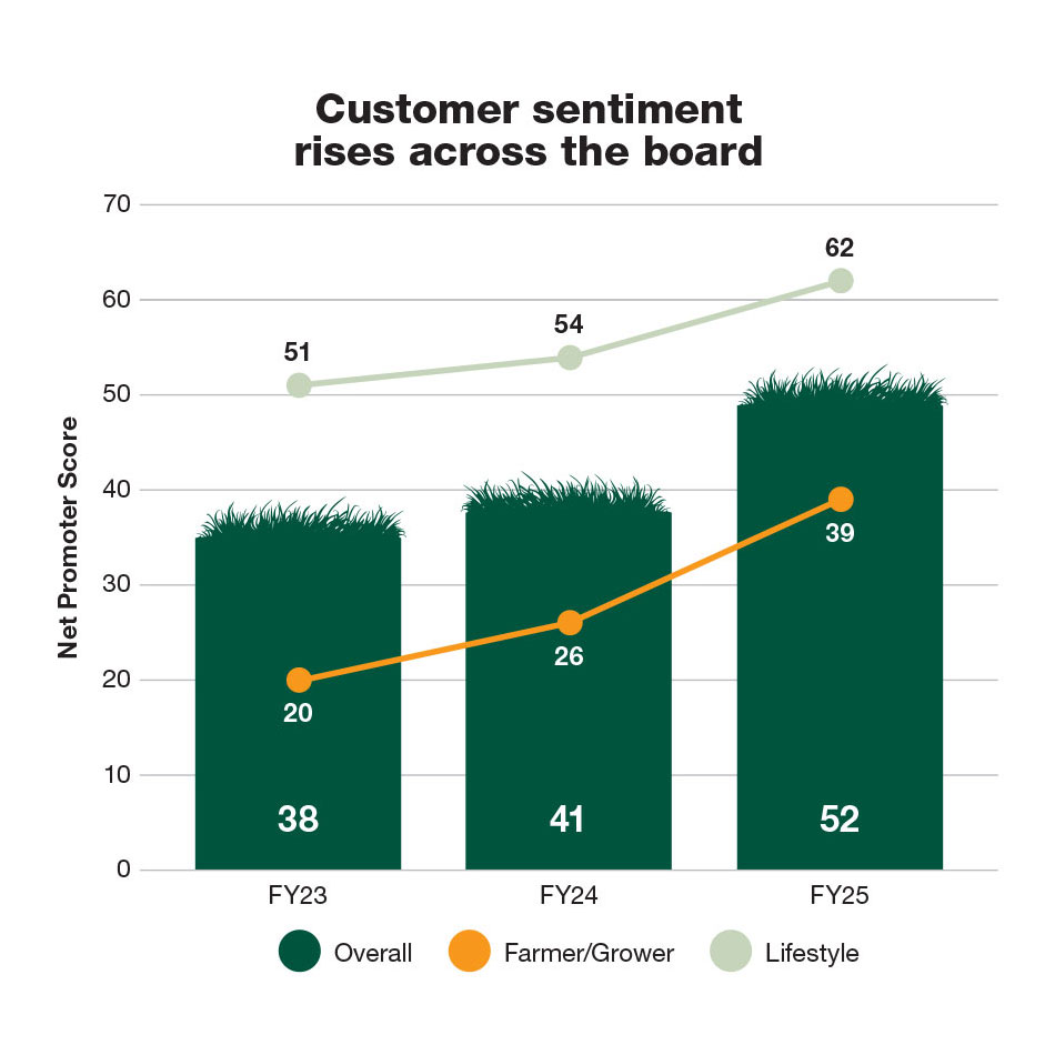 A key measure of our progress is our Net Promoter Score (NPS), which has climbed to 52 this year, up 11 points from FY24. This significant year-on-year gain is driven by improvements in customer service, product availability and pricing. Our farmer and grower segment showed the biggest improvement, with a 13-point increase. We are particularly proud of the gains in our Dairy and Sheep and Beef sectors, where we saw NPS increases of 23 and eight points respectively.